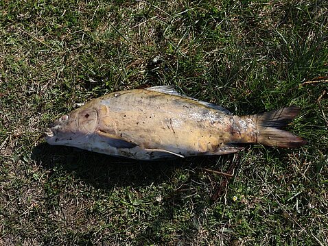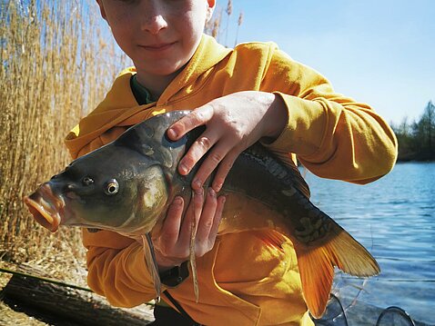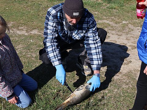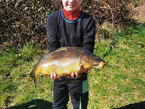 Das Wetter war uns hold und so durften wir einen sonnigen Angeltag am Wasser genießen: für einige von uns war das ein schöner Auftakt in die Saison. Auch wenn nicht jeder mit Fangerfolg beseelt war, so erregte gleich zu Beginn ein treibender, toter Spiegelkarpfen Aufsehen und weckte so einiges Interesse. Schnell war dadurch die Idee geboren dem Nachwuchs das Ausnehmen von Fischen zu erklären, doch scheiterte dieser Versuch leider am Vorzeigeobjekt selbst, das wohl schon etwas zu lange die Sonne gelegen hatte… :-)